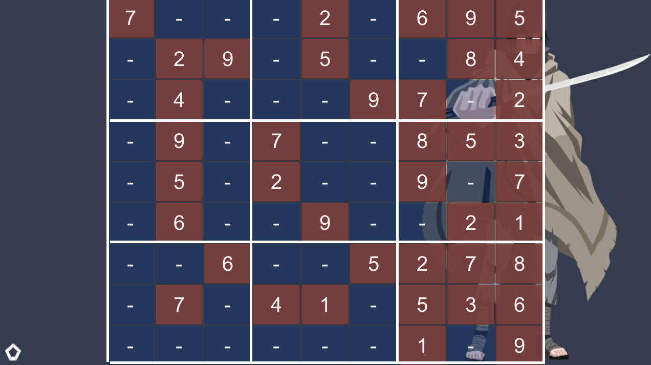 Sudoku là câu đố trí tuệ có hình dạng lưới 9x9, gồm những ô vuông nhỏ tạo thành một ô vuông lớn, mỗi 9 ô vuông nhỏ sẽ tạo thành một khối vuông 3x3, lần lượt ta có 9 khối vuông tạo thành một ô vuông lớn hoàn chỉnh.